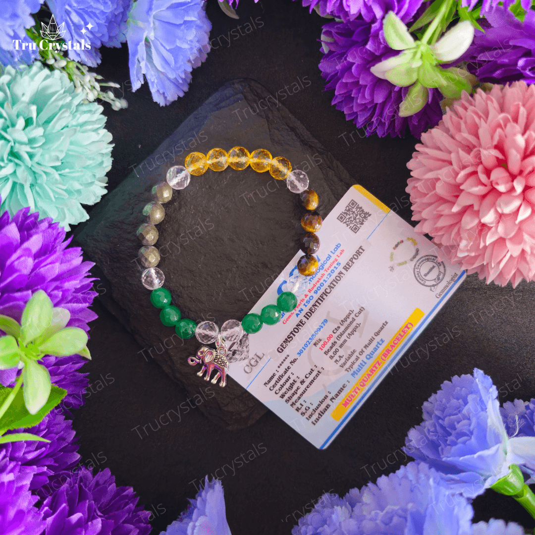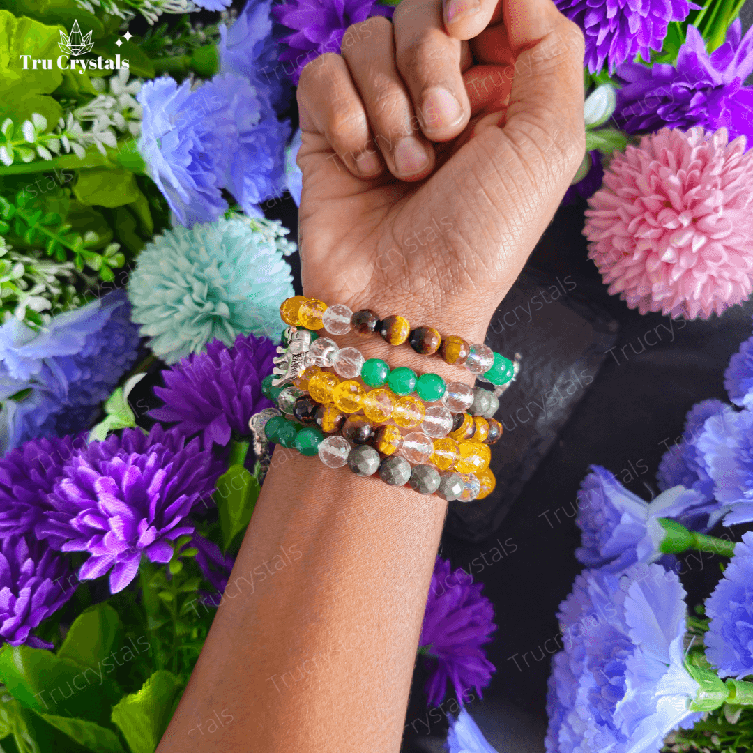 - Immerse yourself in the energies of Green Aventurine, Citrine, Pyrite, Clear Quartz, and Tiger Eye. Each crystal is carefully selected for its unique properties that resonate with abundance, wealth, and positive vibrations.